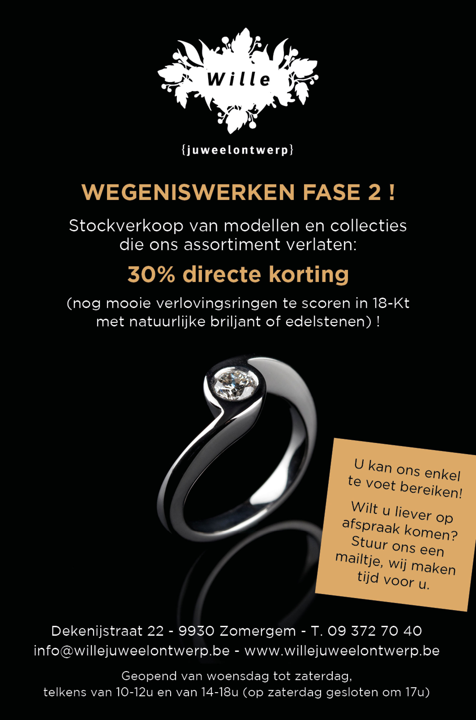 Stockverkoop van modellen en collecties die ons gamma verlaten met een 30% directe korting. We hebben nog zeer mooie verlovingsringen in ons gamma in 18-Kt met natuurlijke briljant en edelstenen.